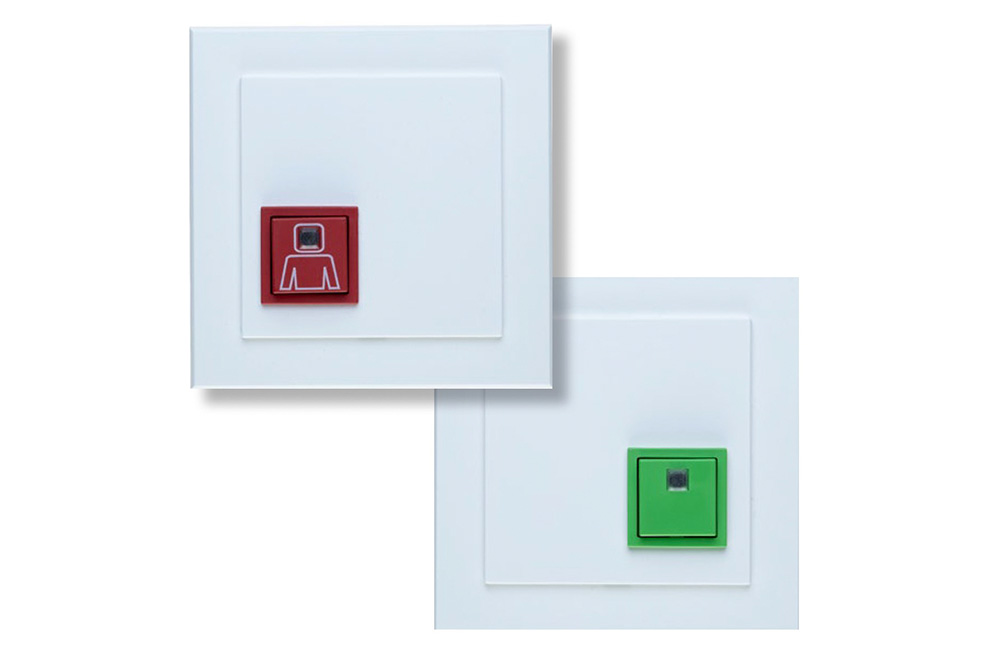 Das Set besteht aus einem Ruftaster, einem Zugtaster und einem Abstelltaster plus DUO-Signalleuchte – alle mit Finde- und Beruhigungslicht ausgestattet, sodass sie auch bei schlechten Lichtverhältnissen leicht zu erkennen und zu bedienen sind. Die Steuerung ist in der mitgelieferten Duo-Signalleuchte integriert, die oberhalb der Außentür montiert wird: Sie leuchtet im Ruhezustand dauerhaft blau als Hinweis auf ein barrierefreies WC. Im Alarmfall wechselt sie wahlweise auf rotes Blinken oder Leuchten und gibt gleichzeitig einen akustischen Signalton aus.